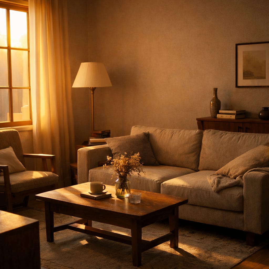 No está abandonada. Está limpia. Los sillones acomodados, las tazas listas, la luz entrando por la ventana a la hora exacta con un brillo dorado casi mágico. Calido. Hay flores secas en un florero que alguna vez estuvieron vivas, con agua turbia que en algún momento fue clara. Todo indica que ahí se espera a alguien.